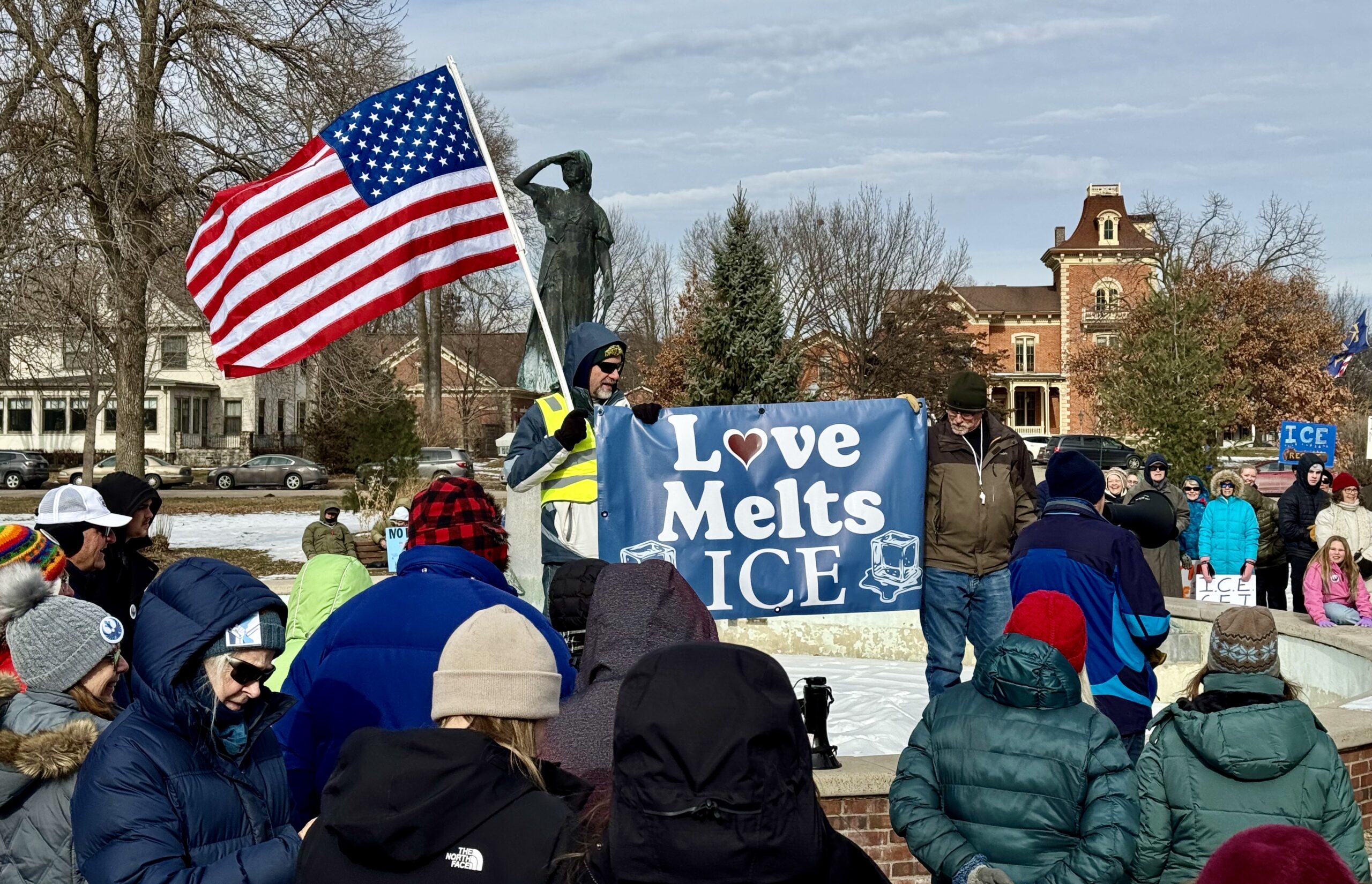 Saturday, Jan. 24th the Winona Rapid Response Team organized a second Freedom March (in the spirit of MLK, Jr.).  Over 300 like-minded citizens (some from Wisconsin) gathered in sub-zero weather. Judging by the number of vehicles honking horns and giving thumbs up along Hwy 61, many others share the same opinion of ICE in our communities.