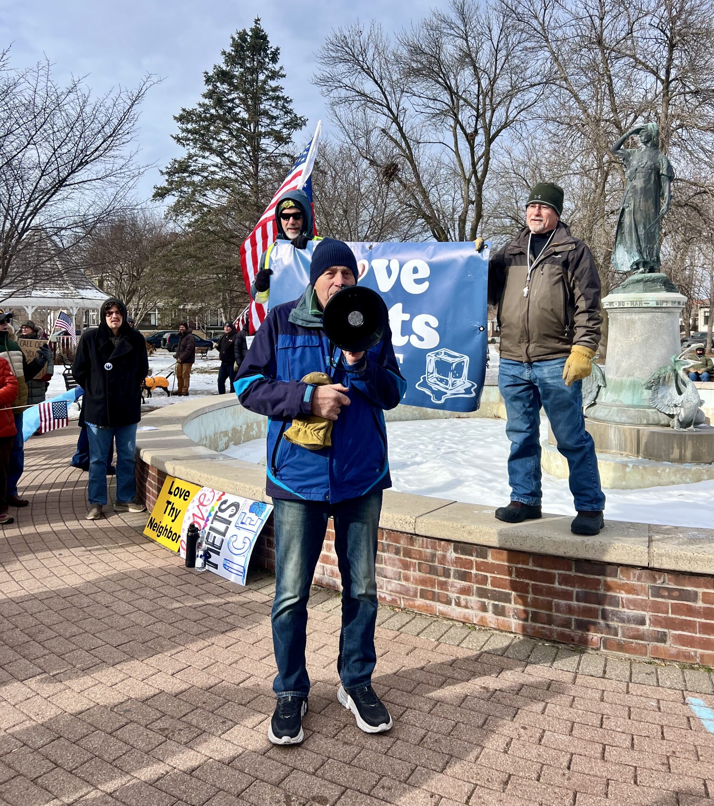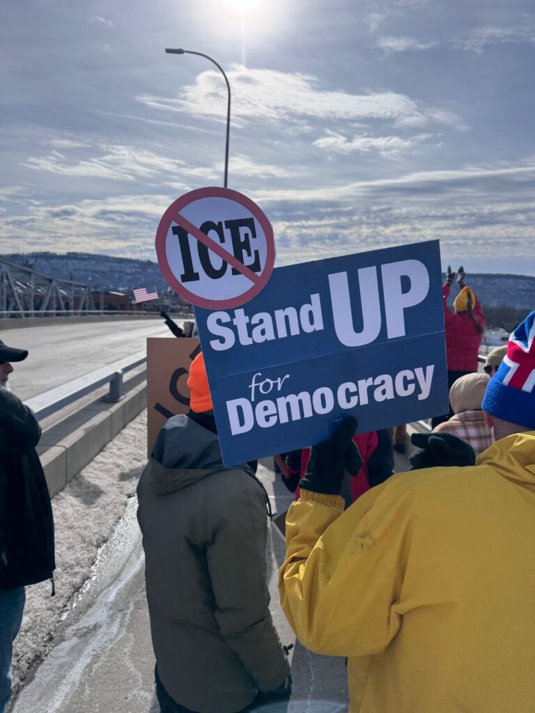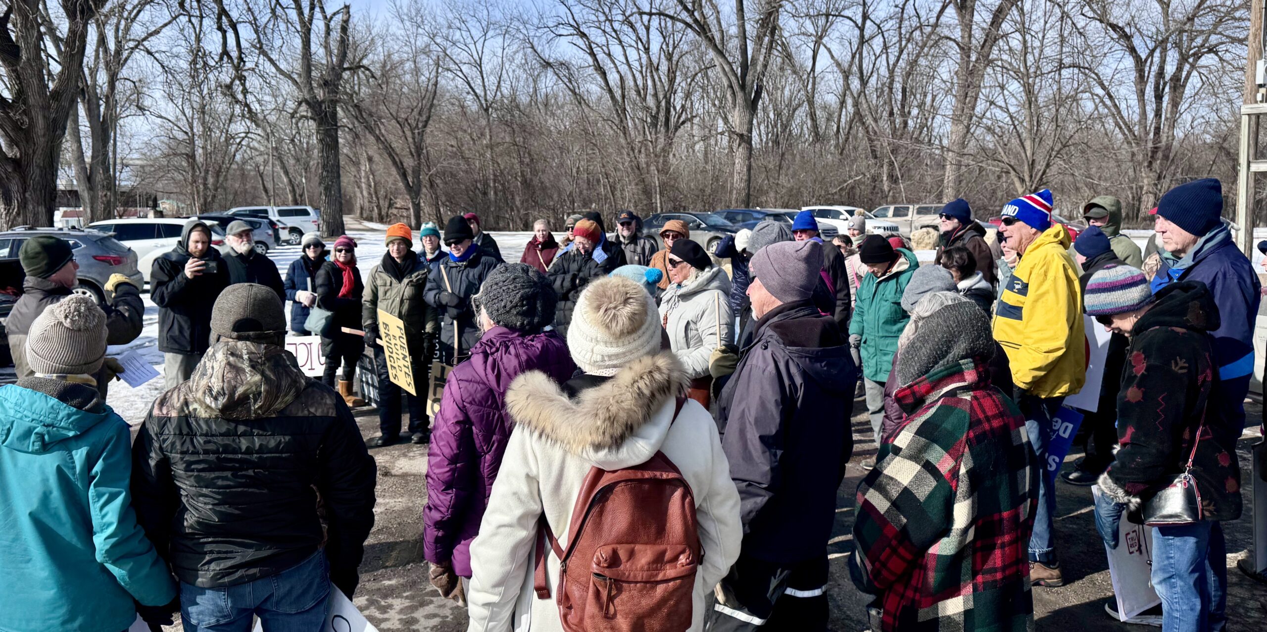 On February 7th the Buffalo County Dems & Friends and the Winona Rapid Response Team organized Freedom March #4. Minnesotans and Wisconsinites (including residents from Buffalo, Pepin and Trempealeau Counties) met at the top of the Winona Bridge and walked to Windom Park.  Crowd size was estimated at between 300 and 400 people. Keynote speaker and Puentes/Bridges Co-Founder John Rosenow talked about the organization’s 20 year effort in building cultural bridges between the immigrants’ home communities and rural farming communities in west central Wisconsin and southeast Minnesota.